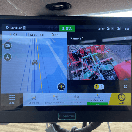 Das manuelle Spurführungssystem AG1 von FJDynamics ist ein preiswerter Einstieg in die Präzisionslandwirtschaft. Mit RTK-Genauigkeit von ±2,5 cm können Basis- und Grenzlinien angelegt, importiert und manuell nachgelenkt werden. Fahrzeuge, Felddaten und Arbeitsgeräte können gespeichert werden. Außerdem lassen sich bis zu zwei WLAN Kameras in das System einbinden um immer den Überblick zu behalten – ideal für große Arbeitsbreiten oder schwer sichtbare Anschlüsse. Verwandle dein FJD AG1 mittels eines Nachrüstkits und einer Section Control Lizenz jederzeit in ein ISOBUS Terminal.